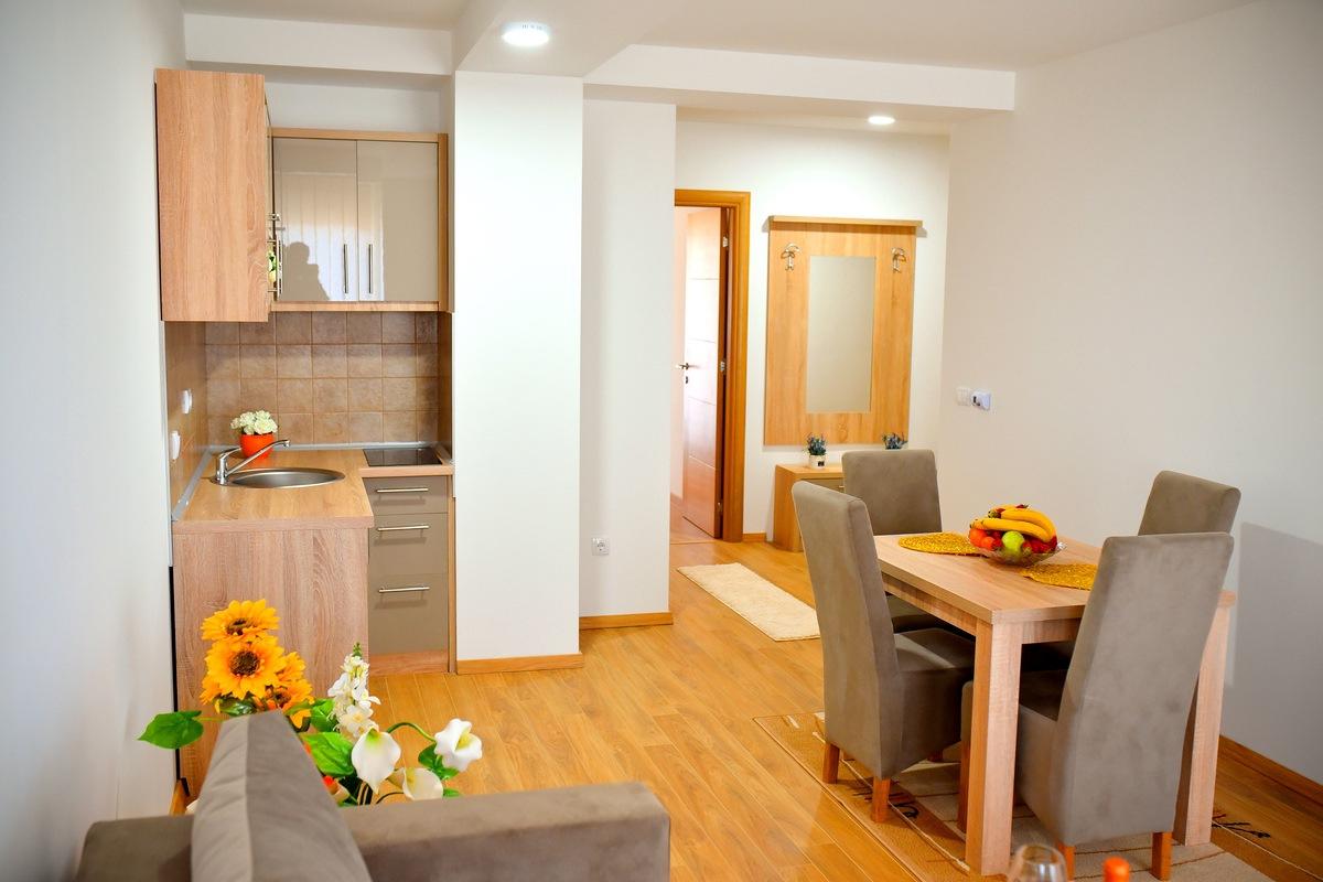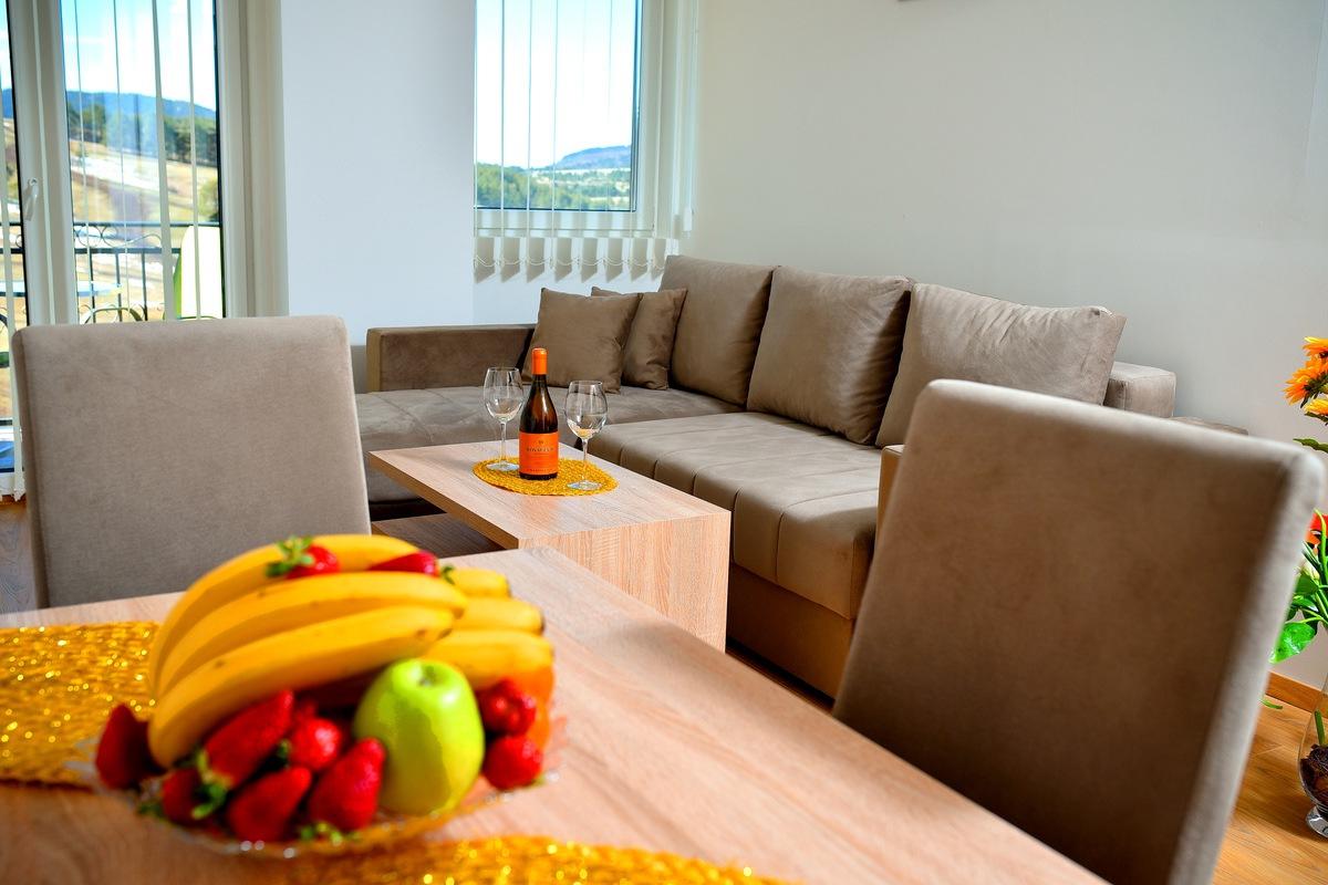 Apartman je luksuzno opremljen i potpuno nov, ima zasebnu spavaću sobu i veličine je 50 m2, terasu sa predivnim pogledom. Apartman ima internet konekciju, kao i kablovsku TV, pogodan je za smeštaj do 4 osobe. Kuhinja je potpuno opremljena. Gostima su obezbeđeni peškiri i posteljina. Posedujemo i dva kreveca za bebe.