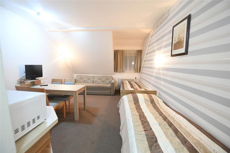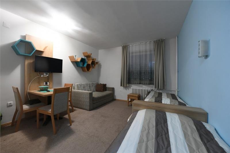 Studio 1+1 (2-3 osobe): kupatilo (tuš), jedna manja prostorija sa ležajem za jednu osobu i sofom na razvlačenje za dve osobe;