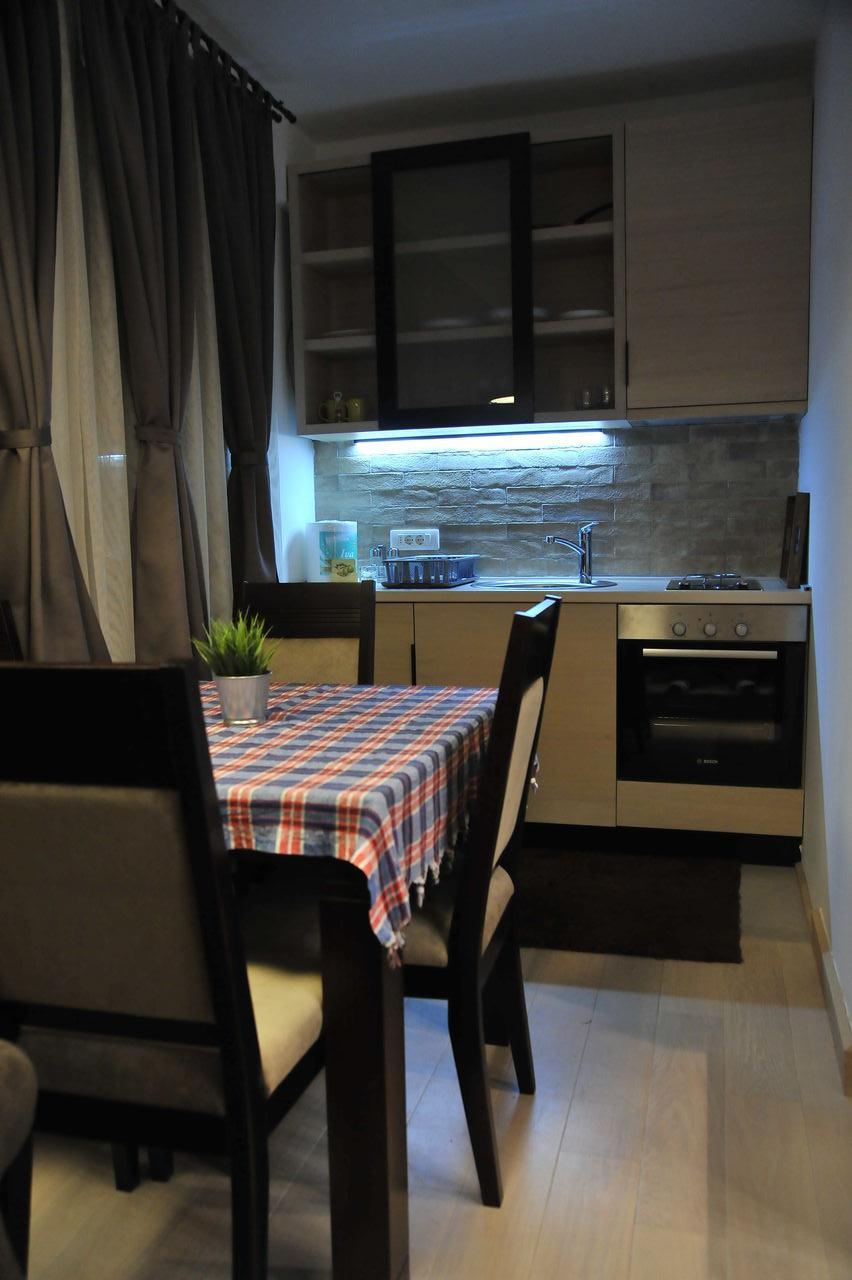 Apartman br.4 (45m2) sadrži,dnevni boravak opremnjen trosedom na razvlačenje i foteljom na razvlačenje TV,komplet opremljenom kuhinjom, spavaćom sobom koja sadrži francuski ležaj, plakare, komodu i TV, hodnik sa plakarima,kupatilo (internet, kablovska, parking, lift).