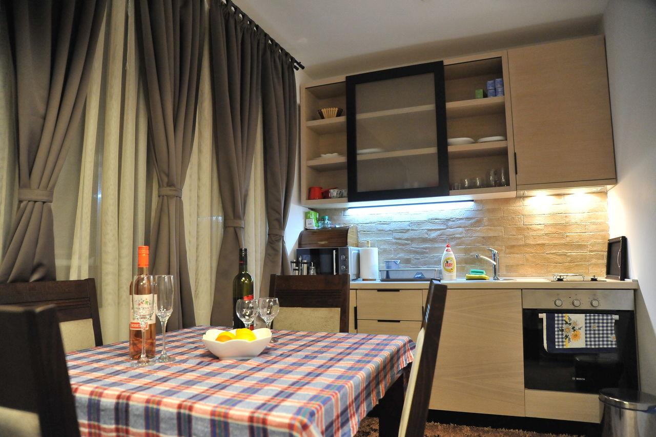 Apartman br.5 (45m2) sadrži, dnevni boravak opremnjen trosedom na razvlačenje i foteljom na razvlačenje TV, komplet opremljenom kuhinjom, spavaćom sobom koja sadrži, dva troseda na razvlačenje i TV, hodnik sa plakarima, kupatilo (internet, kablovska, parking, lift).