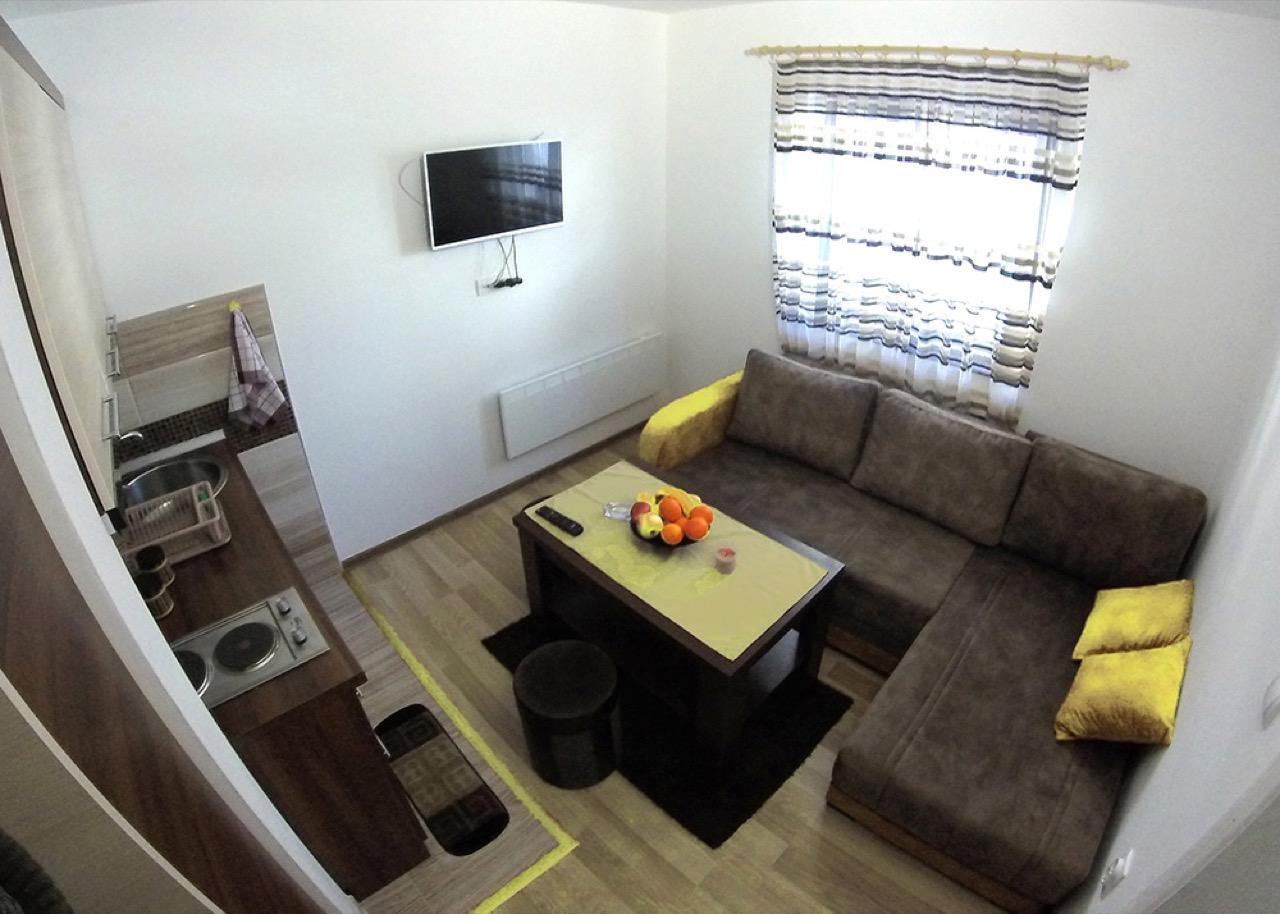 U ponudi su tri apartmana površine 25m2 u kome se nalaze spavaća soba, dnevni boravak sa kuhinjom i kupatilo. U dnevnoj sobi se nalazi ugaona garnitura na razvlačenje, a u spavaćoj sobi francuski ležaj.