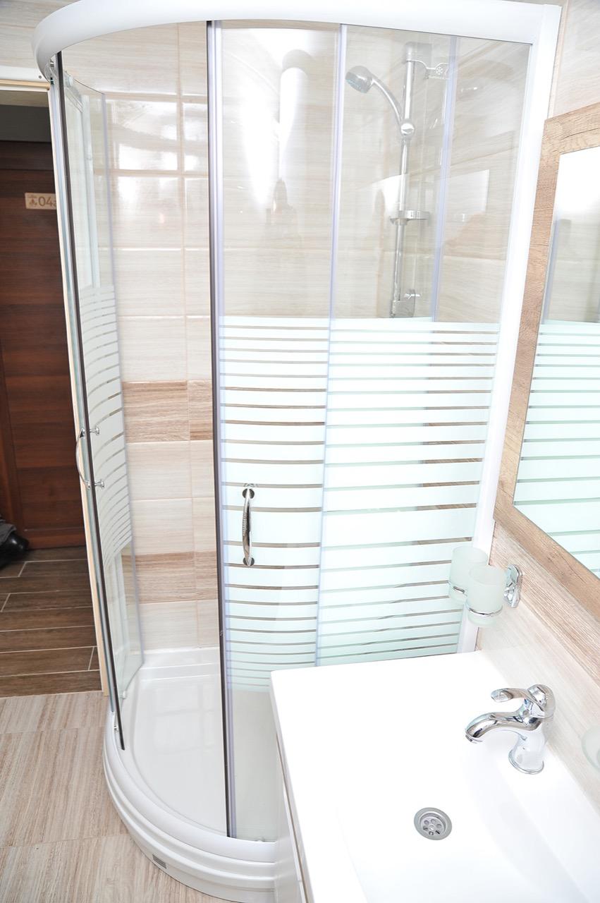 Kupatilo opremljeno je tuš kabinom, a peškiri, posteljina i papuče su obezbeđeni.