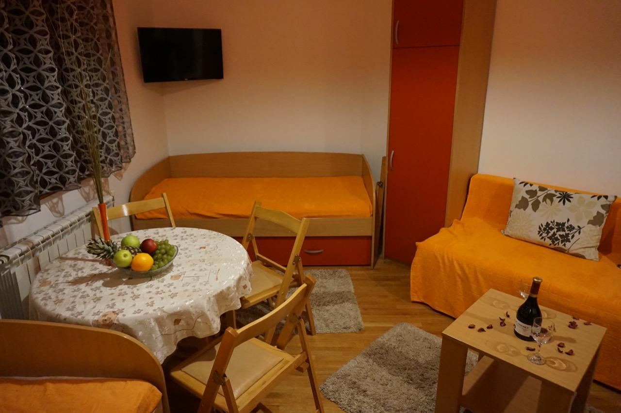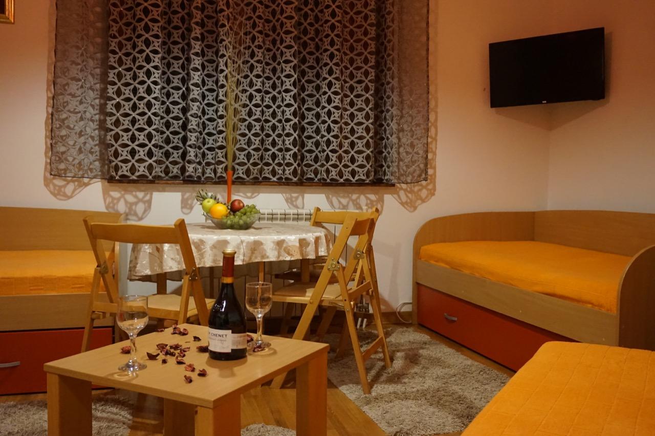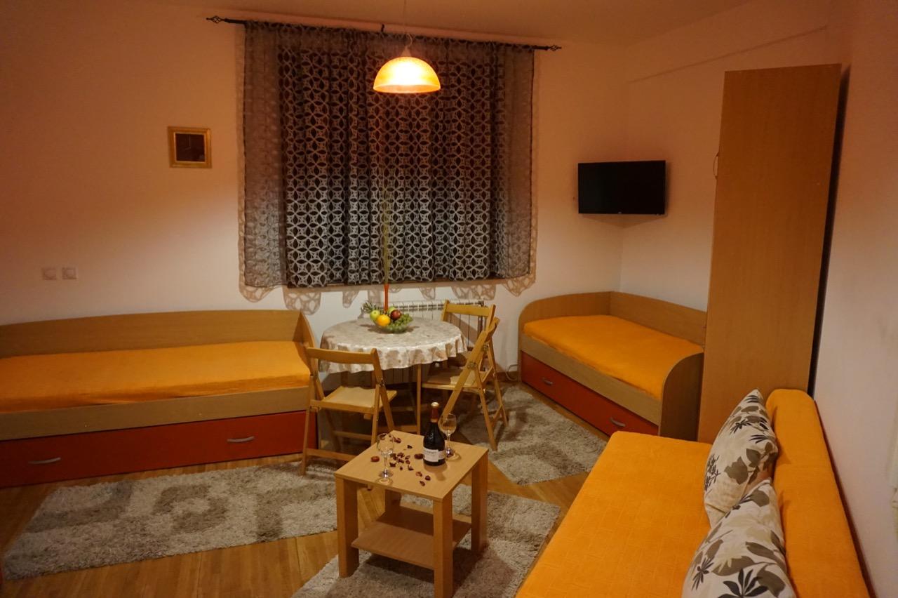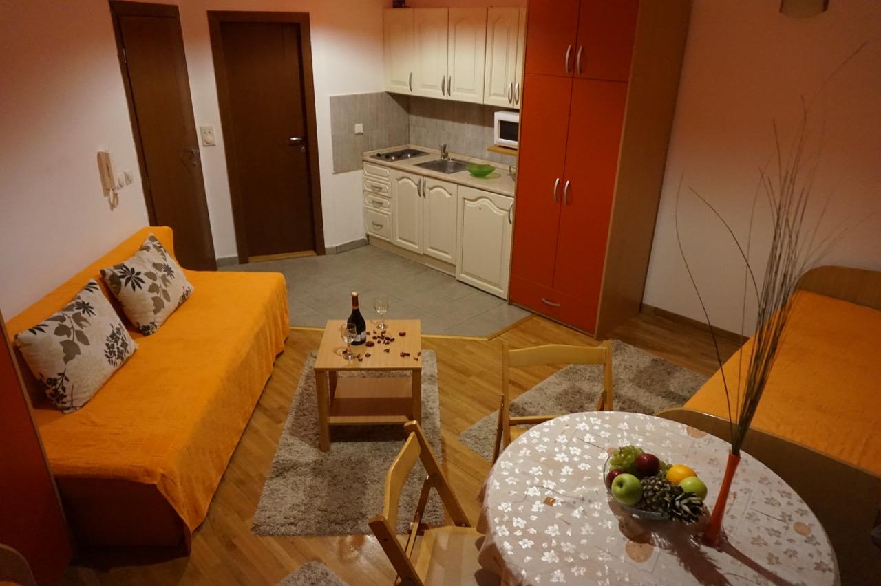Apartman može da primi maksimalno do 5 osoba. Poseduje dva kreveta na razvlačenje i sofu koja je takođe na razvlačenje. Apartman je opremljen centralnim grejanjem, ima kompletnu mini kuhinju, frižider, mikrotalasnu pećnicu, SAT TV, WiFi i kupatilo sa tuš kabinom, posteljinu i peškire.