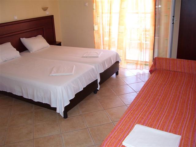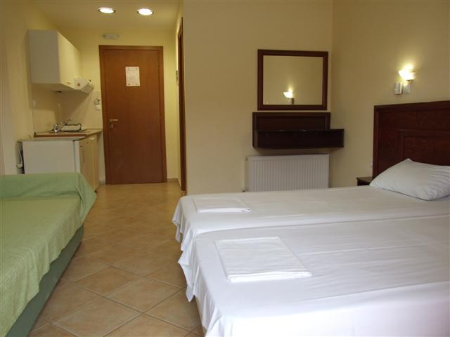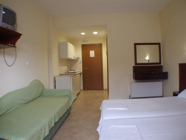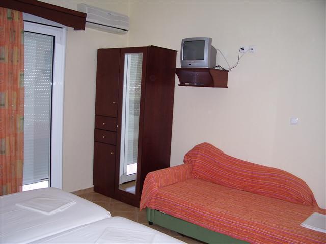 Vila Ksantos se nalazi na atraktivnom mestu, u centru Pefkohorija i praktično na samoj plaži, tj. na svega desetak metara od gradske plaže i šetališta. Sadrži dvokrevetne i trokrevetne studije (dva spojena standardna kreveta + sofa) na prvom spratu, opremljene TV-om i klima-uređajem (uračunat u cenu u periodu 14.06-07.09). Sve smeštajne jedinice u vili Ksantos poseduju kuhinje i imaju terase sa bočnim pogledom na more. Veličina studija je cca 25m² + terasa. Vila Ksantos nema sopstveni parking.