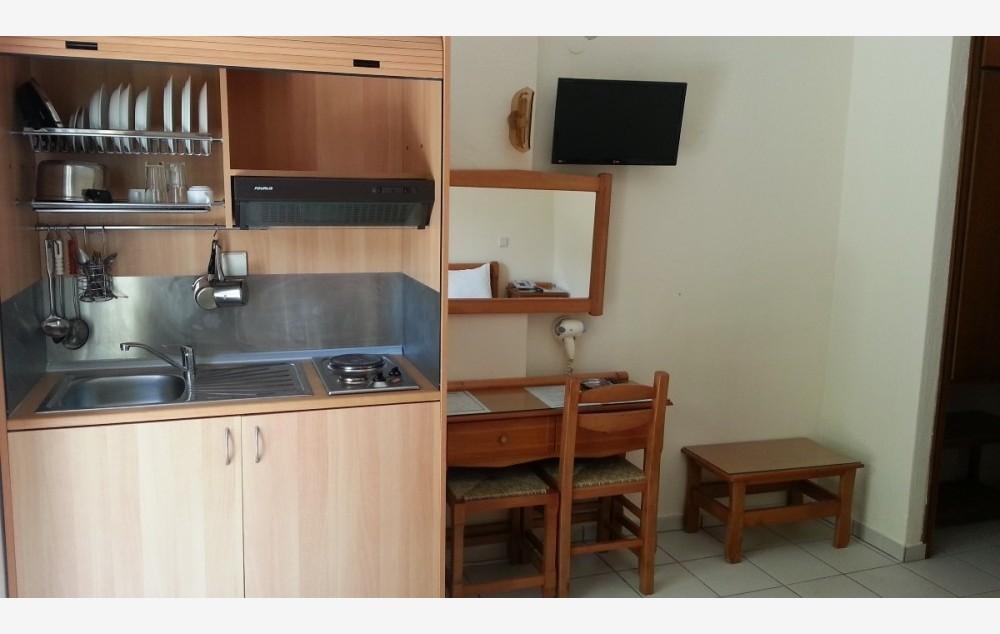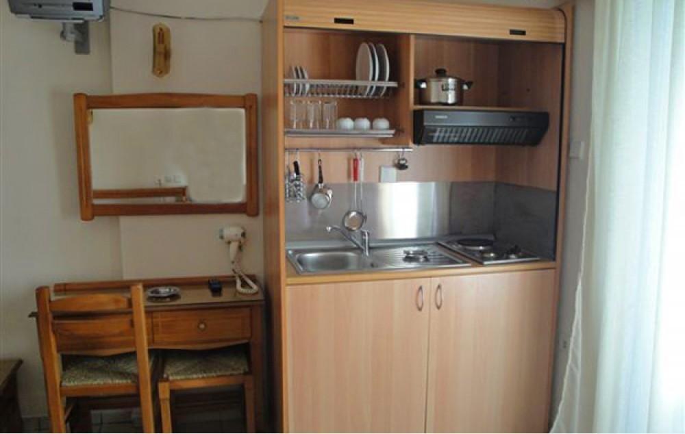 Opis: Hotel ima bazen i okružen je lepim vrtom, u našoj ponudi su dvokrevetna i trokrevetna studija koja se nalaze u spuštenom prizemlju. U neposredoj blizini hotela se nalazi javni, besplatni parking. Svaka smeštajna jedinica ima opremljen kuhinjski deo, kupatilo/wc, fen, peškire, terasu, WiFi internet, TV i klima uređaj (uz doplatu na licu mesta, od 5€ dnevno). Čišćenje studija je na dnevnoj bazi.