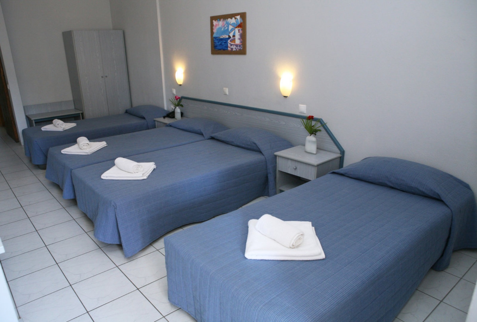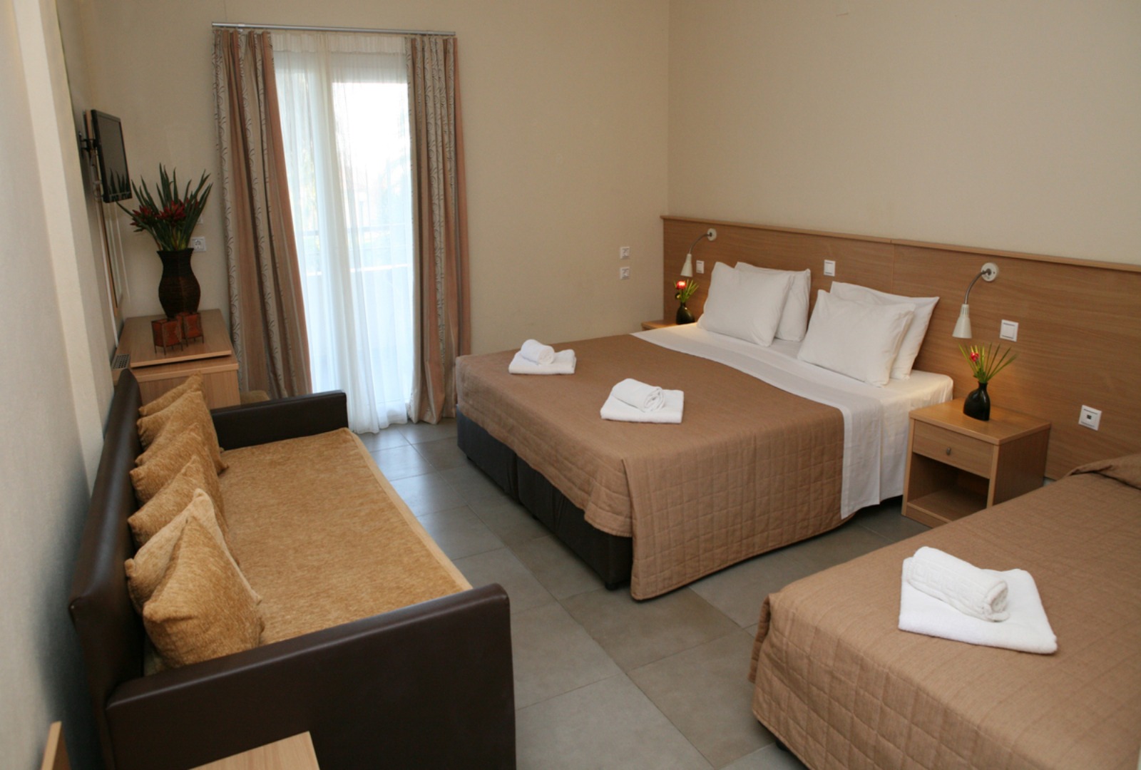Prostrane sobe u hotelu Kalives Resort su svetle i moderno uređene. Imaju TV i frižider, kao i kupatilo sa fenom za kosu. Sa balkona se pruža pogled na vrt i bazen.