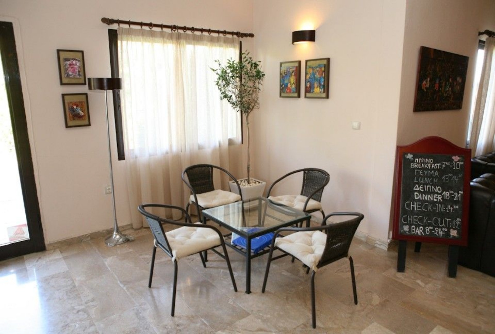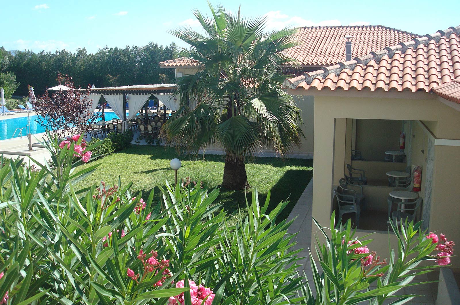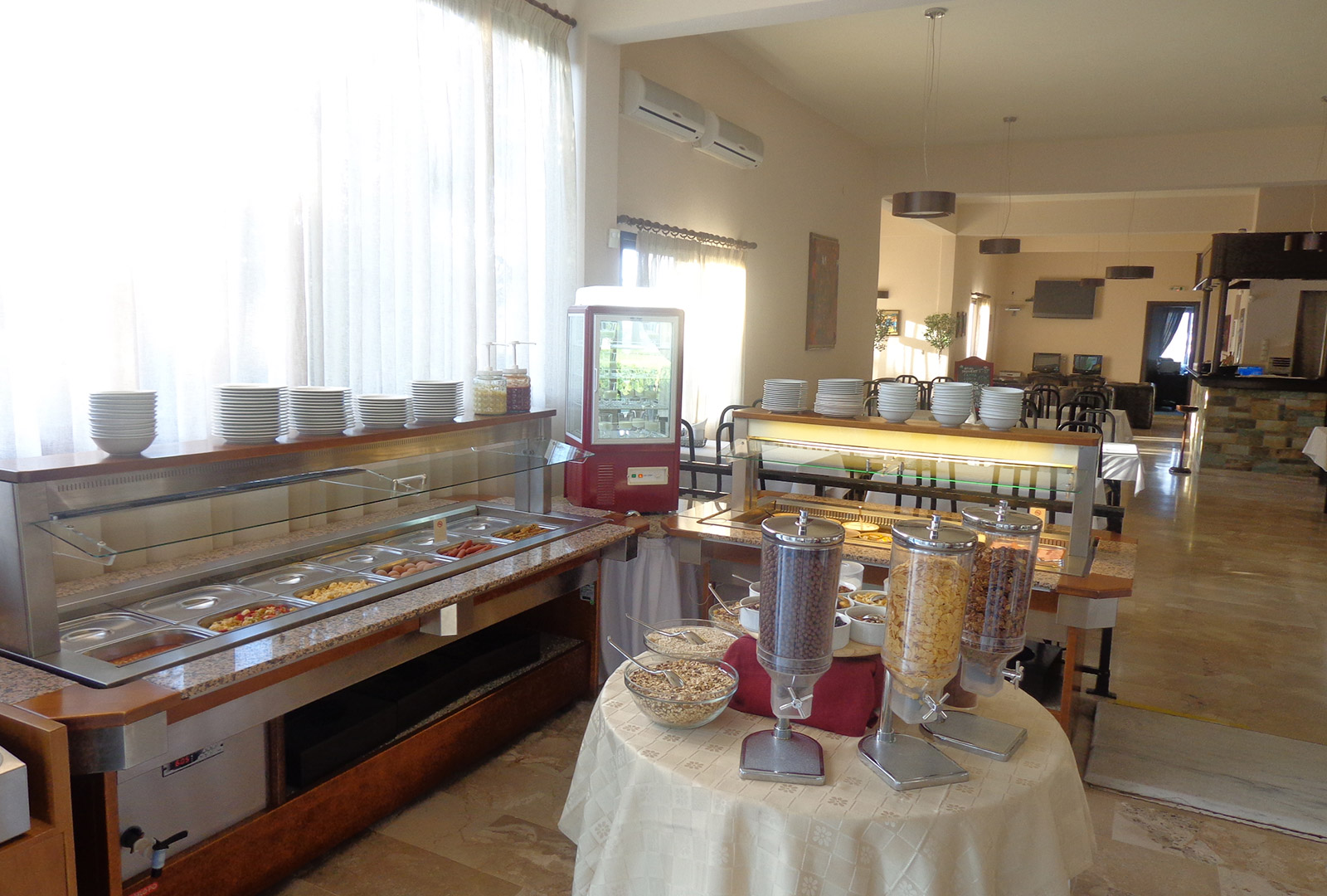 Gosti mogu uživati u grčkoj kuhinji i regionalnim vinima u restoranu, ili se mogu opustiti uz piće u baru. Hotel za najmlađe goste nudi dečije igralište i dečiji bazen.
