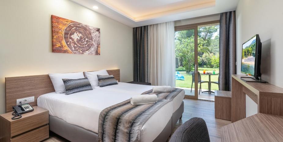 Sve hotelske sobe su uređene u modernom stilu i nude pogled na bazen ili vrt. Dostupan je besplatan WiFi.