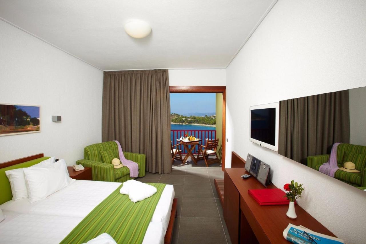 Apartmani tipa "suite" i sobe u hotelu Skiathos Palace klimatizovani su i ukusno uređeni. Sve smeštajne jedinice su opremljene satelitskom televizijom, mini-barom i besplatnim toaletnim priborom. Sve izlaze na namešteni balkon.