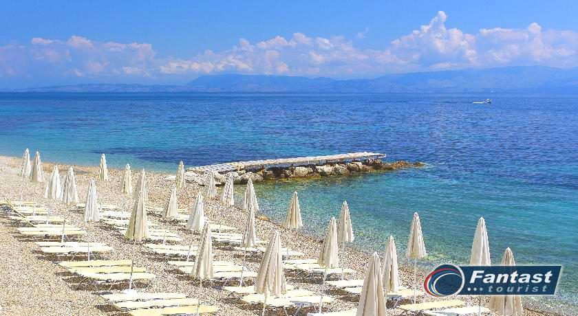 (prometna ulica između). Do plaže se dolazi podzemnim prolazom. Od grada Krfa udaljen je 16km, od aerodroma 14km, a od susednog mesta Benices 3km.