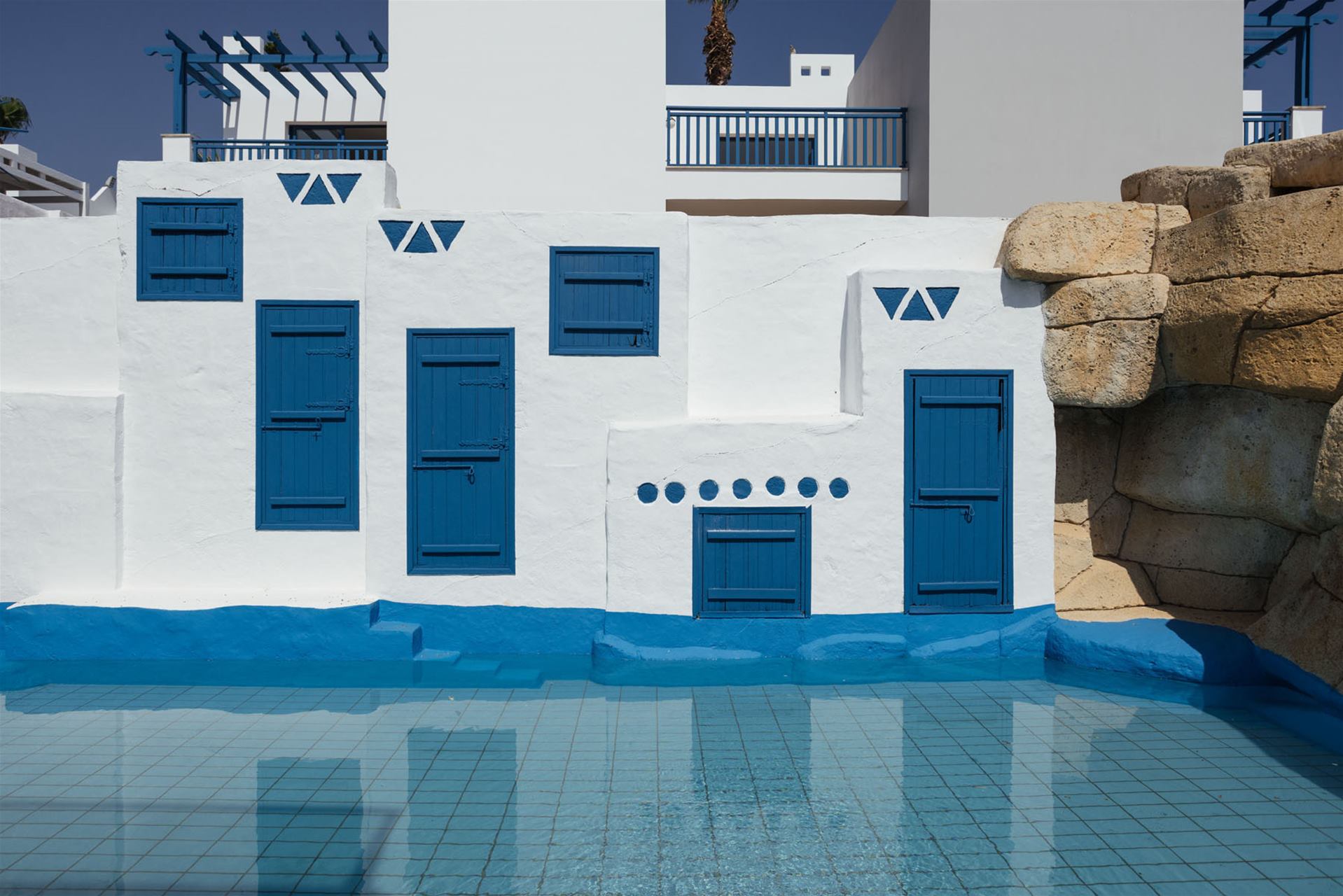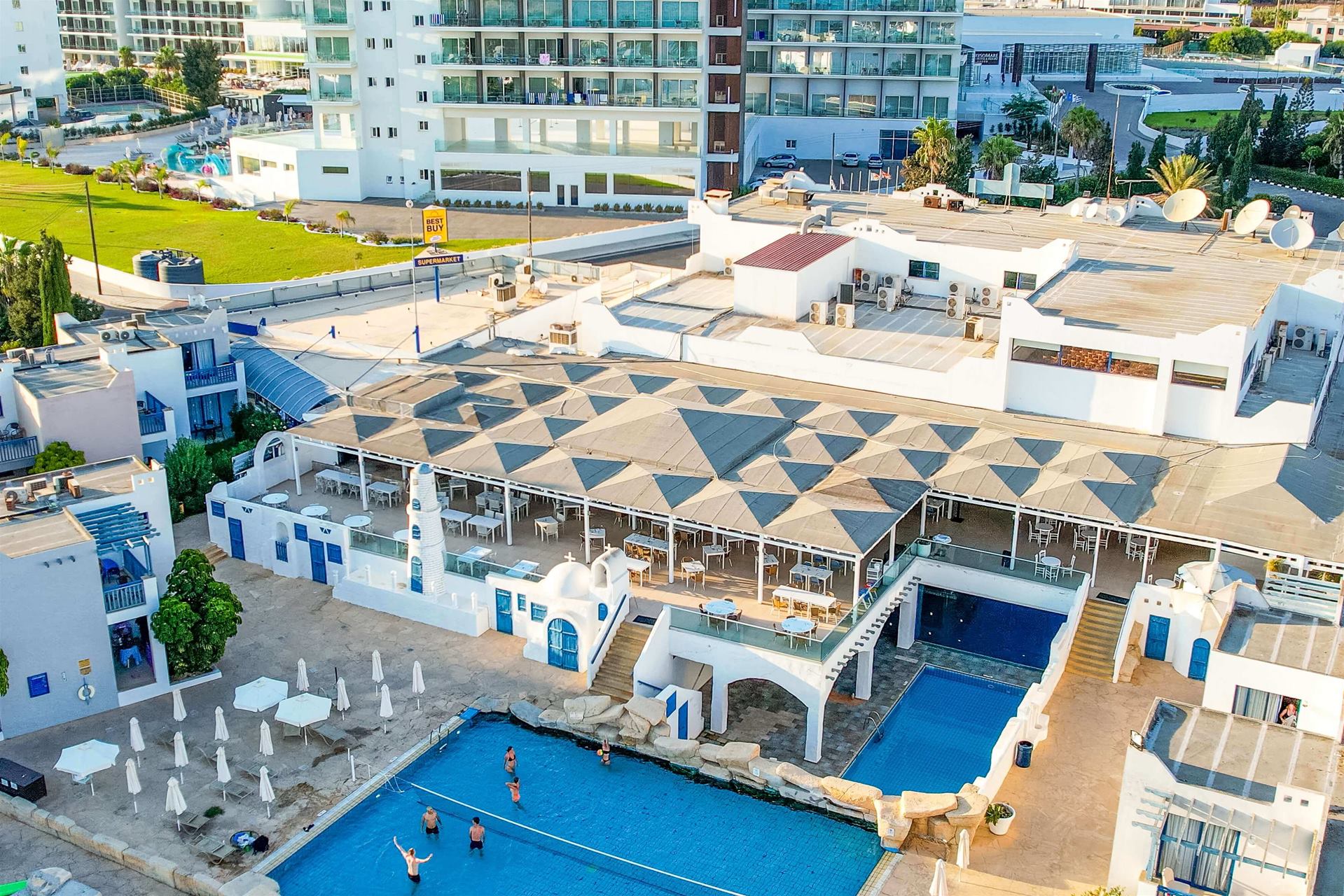 Hotelski sadržaj: recepcija, restoran, dva bazena, bazen za decu, bar, Wi-Fi (besplatno u javnim prostorijama), parking.