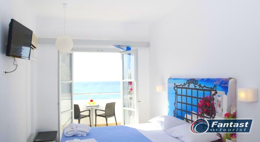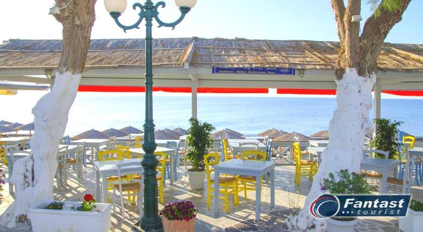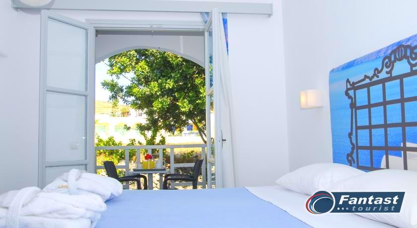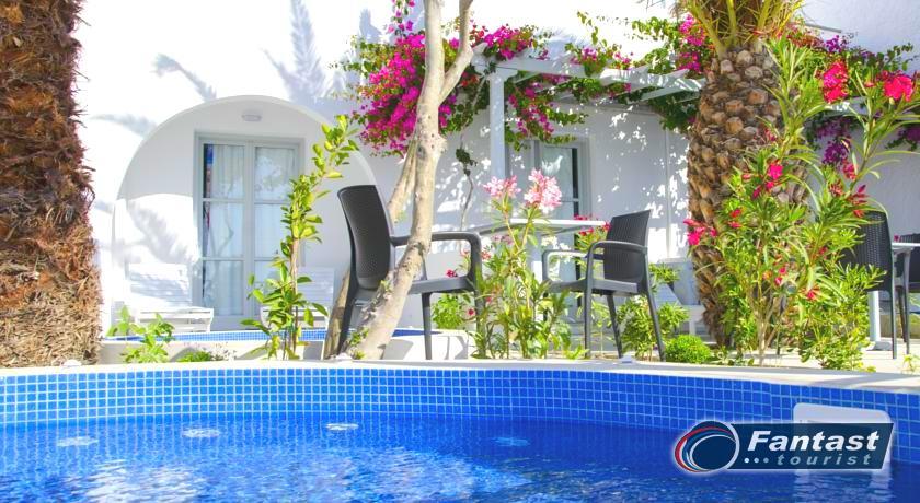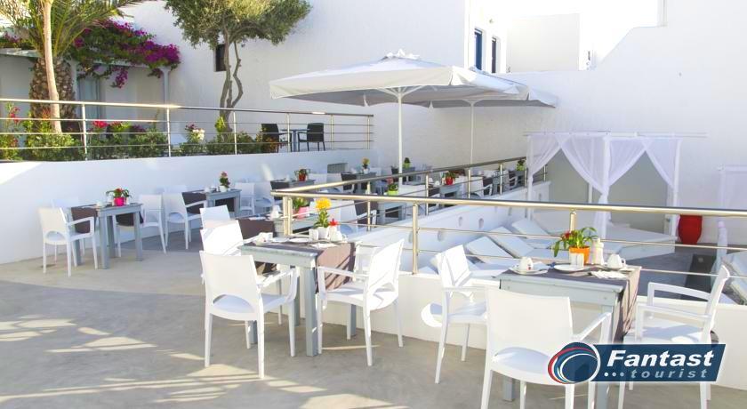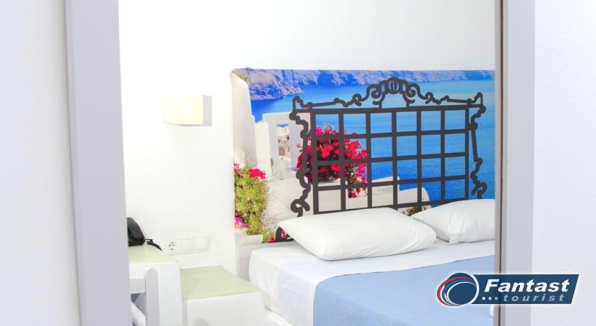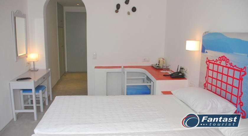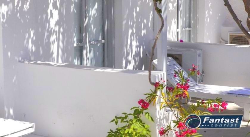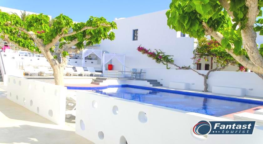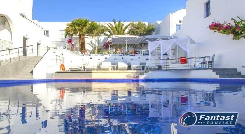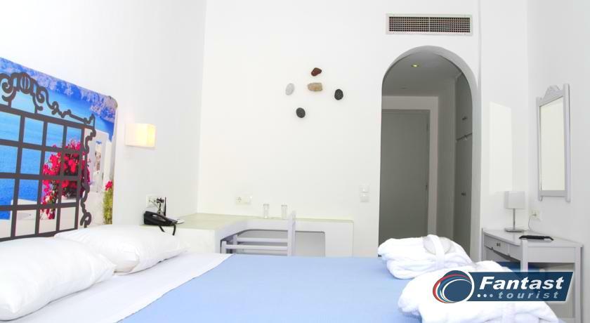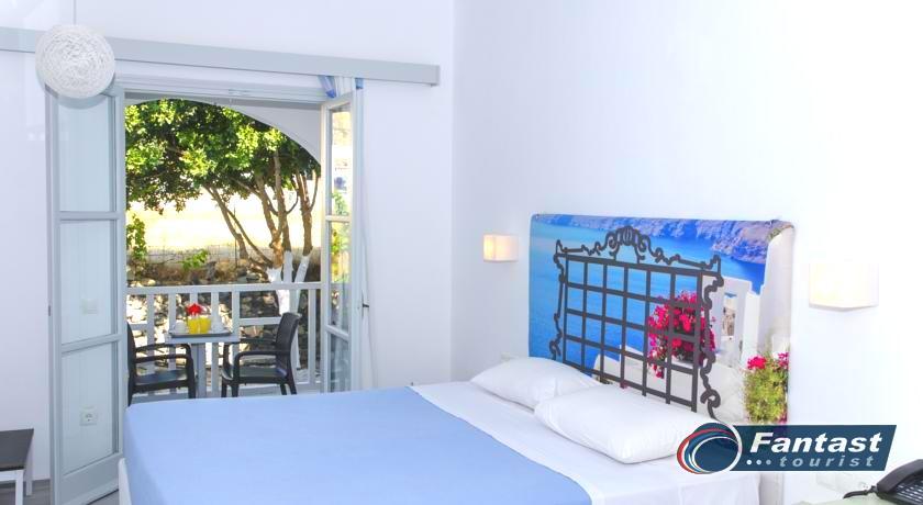 Lokacija: Hotel je smešten preko puta plaže (deli ih šetalište), u centru mesta Kamari. Hotel je potpuno renoviran ove godine. Sagrađen je u tradicionalnom stilu i u blizini je restorana, taverni, barova i prodavnica. Hotelski sadržaj: Hotel ima baštu sa dosta zelenila, salu za doručak, TV salu, bar, snack bar pored bazena, restoran, bazen, ležaljke i suncobrane, sef (uz doplatu), recepciju,menjačnicu,malu teretanu... Sobe: Sve sobe su sa klimom, SAT TV, frižiderom, telefonom, radiom, kupatilom sa fenom za kosu, balkonom,/terasom, sef (uz doplatu). Usluga: Noćenje sa doručkom (švedski sto-samoposluženje).