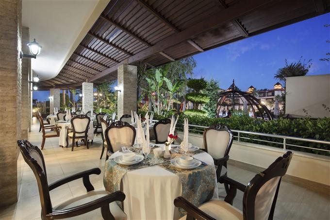 Usluga u hotelu je All Inclusive Plus samoposluživanje – izbor više jela prema hotelskim pravilima u glavnom restoranu (doručak, kasni doručak, ručak, večera, ponoćna supa), užine, kolači, kafa i sladoled u određeno doba dana. Takođe koncept obuhvata lokalna alkoholna i bezalkoholna pića. A’ la carte restorani (italijanski, turski i riblji) su besplatni jednom u toku boravka, uz obaveznu rezervaciju.