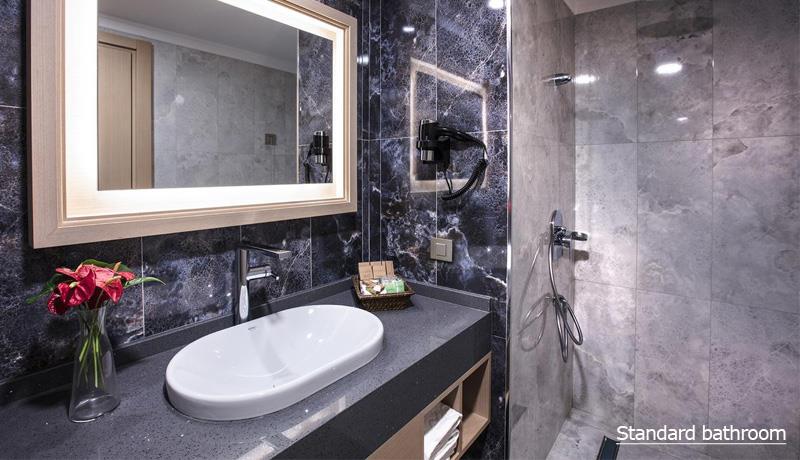 Standardne sobe su površine 34m2, (max 2 odrasle + 2 dece ili 3 odrasle), sadrže francuski ležaj, standardni ležaj i sofu ili dodatni krevet na rasklapanje, kupatilo, fen za kosu, TV, telefon, individualnu klimu, sef, wi-fi internet, balkon/terasu.