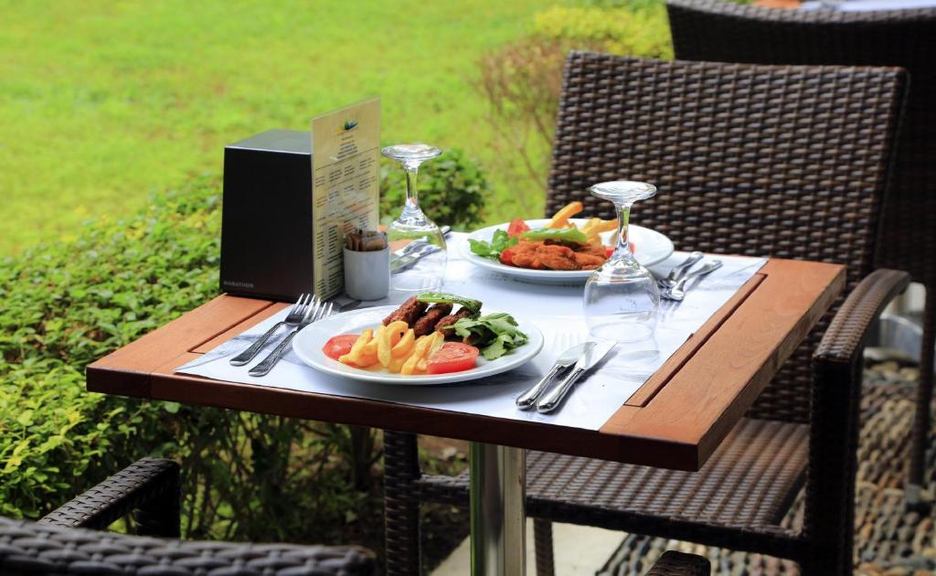 All inclusive usluga (samoposluživanje) Glavni restoran (doručak, kasni doručak, ručak, večera, ponoćna supa), beach bar (samo pivo od akoholnih pića), pool bar (užine i pića), lobby bar (sva alkoholna i bezalkoholna pića), a’la carte restoran nacionalne kuhinje koji gosti mogu da koriste besplatno jednom u toku boravka.